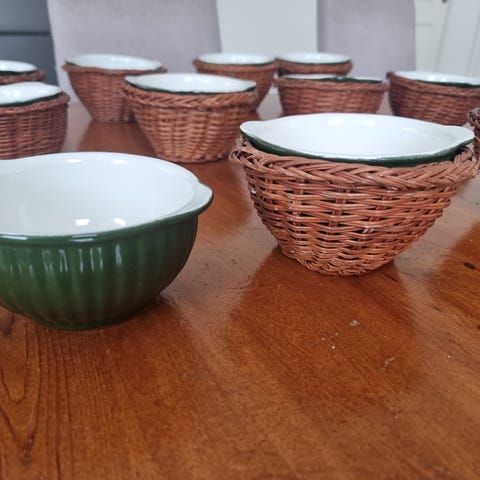 Seks suppeskåler for løksuppe eller lignende. Kan settes i ovn for gratinering. Høyde 10cm. Diameter 10,5cm. Volum 4dl.