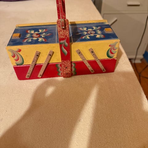 – Sy-/hobbyhylle med stoffruller, tråd og små detaljer