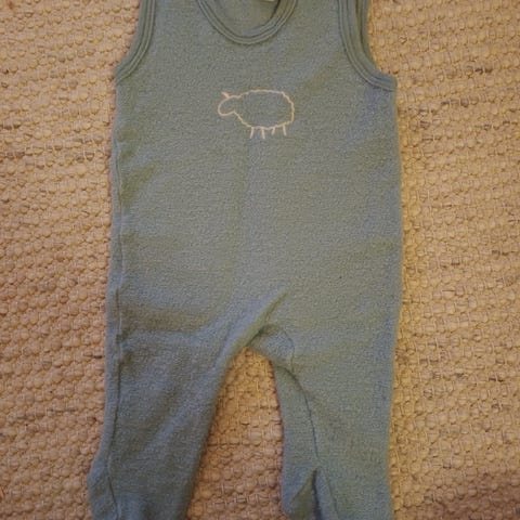 Nøstebarn ullbukse i størrelse 56 for unisex baby. Buksen er ermeløs og i beige ullmateriale, med trykknapper langs det ene benet for enkel av- og påkledning. Den har et enkelt sauemotiv foran. Passer som myk og varm heldrakt/overdel til baby i hverdagsbruk eller som mellomlag på kjølige dager.