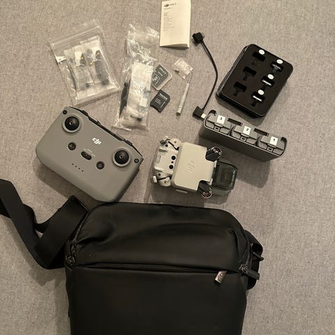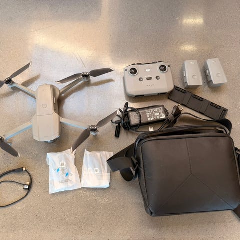 DJI Mini 2 drone med kontroller, bæreveske, batterilader, ekstradeler, ett optimalt batteri og to deldefekte batterier uten bruks og slitasjemerker. Såvidt brukt i firmasammenheng.