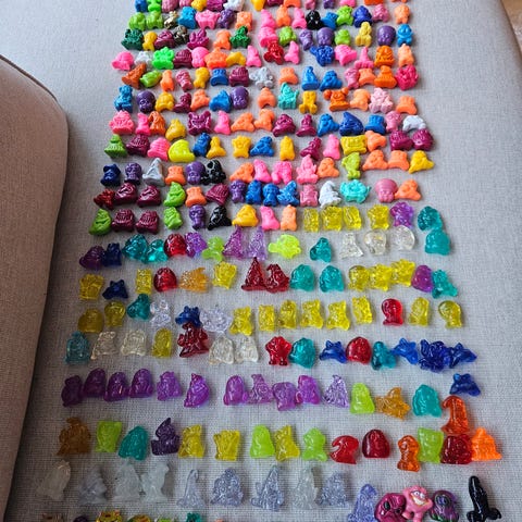 Dracco samlefigurer i plast, i flere ulike former og farger. Figurenes størrelse er små og egner seg som samleobjekter, lekefigurer eller til utstilling. Settet på bildet viser et utvalg av ulike figurer i transparente, sterke farger som blå, gul, rød, grønn og lilla. Alle figurene er merket med Dracco -logo og nummerering på baksiden.