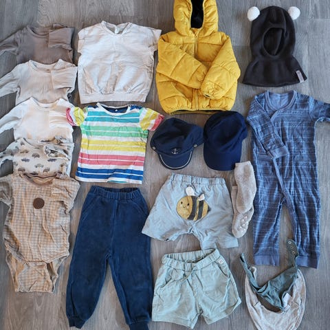 Fem body størrelse 80, en ullbukse 74, tre shorts 86, to gensere 86, ullvotter, sokker, en shorte 80 og en shorte i 98, pluss rn koseklut.