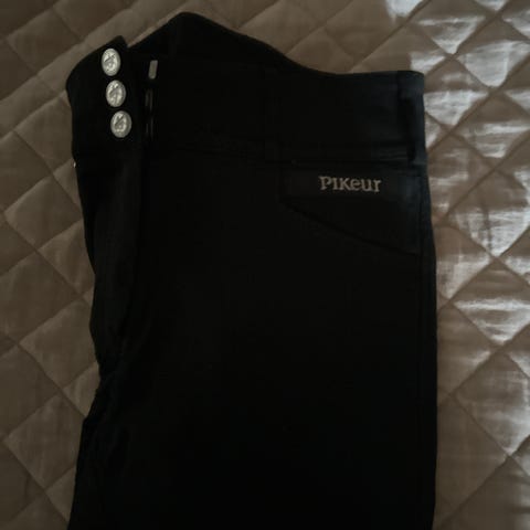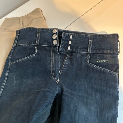 Pikeur ridebukse for dame i størrelse 44. Buksen er i en mørk blå farge. Modellen har beltehemper og lommer foran. Materialet er et elastisk stoff som gir god bevegelsesfrihet ved ridning . Helskinn, finnes ikke i salg lenger. Er sydd litt i skrittet foran, ellers veldig hel og pen.
