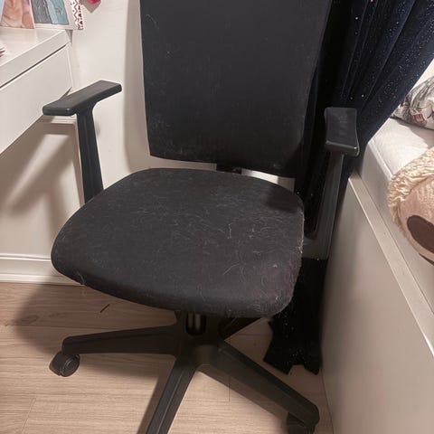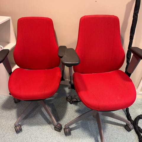 2 svarte kontorstoler med høy netting rygg og "skinn" sete og nakkestøtte. Regulerbar. Selges for 100,- per stykk helst samlet.