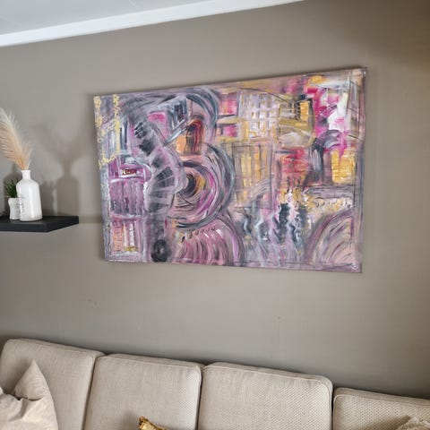 Abstrakt maleri på lerret i rektangulært format. Motivet består av horisontale, diffuse striper i hovedsakelig grå, blå og kobberaktige toner. Overflaten har en lett glans som gir et metallisk preg. Bildet er spent opp på blindramme og kan henges direkte på vegg. Passer som veggdekor i stue, gang, kontor eller andre oppholdsrom.