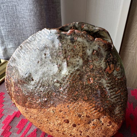 Håndlaget vase med skjell dekor i hvit overflate. Vasen har ujevn, organisk form og er dekorert med ulike skjell rundt hele utsiden. Åpning i toppen og hul innside gjør den egnet som pyntegjenstand eller til tørkede blomster. Materialet fremstår som concrete eller lignende masse med påsatte skjell i naturfarger. Passer som interiørdetalj i stue, gang eller soverom.