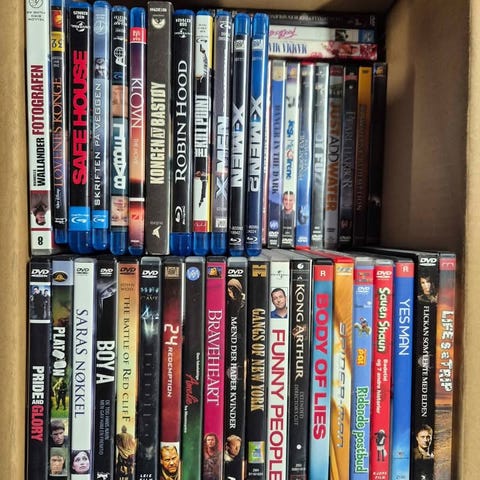 Samling med diverse DVD-filmer i ulike sjangre. Bildene viser blant annet flere kjente titler innen drama, action, komedie og thriller. Filmene leveres som standard DVD-plater i originale cover. Egner seg for avspilling på DVD-spiller som støtter vanlig DVD-format. Antall titler og konkrete filmtitler fremgår av bildene. Her er masse som aldri har blitt spilt,og en del uåpnet også. Hbo 500kr,helst hentes på Sandmovegen 79,Tiller