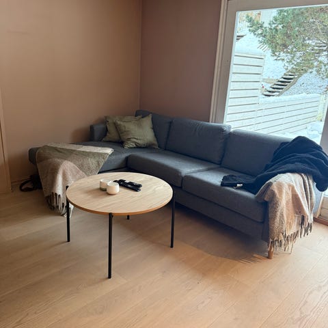 Dette er en modulsofa slik at den kan tas fra hverandre ved transport. Må hentes. Pris kan diskuteres ved rask henting.