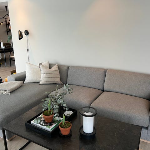 U formet sofa fra Skeidar kjøpt for 5 år siden. Den har ingen hull, men en del merker etter vannsøl da vi har to barn.