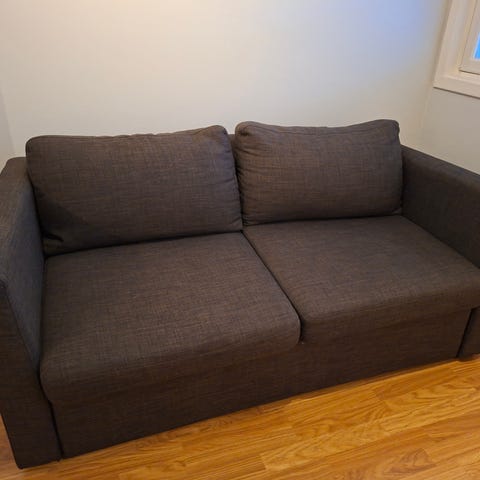JYSK HARNDRUP er en 3-seters sovesofa i mørkeblått stoff med en skandinavisk stil. Montert størrelse er omtrent B210 x H85 x D92 cm. Som seng gir den en liggeflate på ca. 114x190 cm. Sofaen har skumputer i sete og rygg, samt ben.