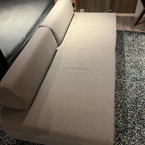 Daybed, sovesofa med matchende pute i beige. Fin og praktisk gjesteseng. Om den slås ut er den 190x152 cm. Selges fordi jeg ikke har plass til den lenger. Kjøpt ny i sommer og er nesten ikke brukt. Må hentes i Kristiansand.