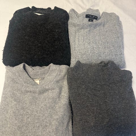Innhold:rosa genser,brun hjemmestrikket ullvest,sort shorts( str 44- men liten i str),grønn jakke,hvit lang bluse,rustrød omslags kjole,grå bukse,lyseblå bluse,rosa/ hvit bluse,sort skjørt,offwhite genser,lue m dusk, rosa lue,rosa tynt skjerf,stripete skjerf,sort/ grått skjerf.Selges samlet for 130,-