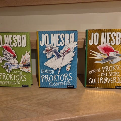 Jo Nesbø Doktor Proktor bokserie med 4 bøker. Pakken inneholder titlene «Doktor Proktors prompepulver», «Doktor Proktors tidsbadekar», «Doktor Proktor og det store gullrøveriet» og «Doktor Proktor og verdens undergang. Kanskje». Bøkene er barnebøker i romanformat med illustrasjoner, innbundet utgave. Egner seg for barn som liker humoristiske og fantasifulle fortellinger.