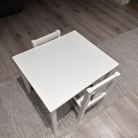 IKEA barnebord med 2 stoler i hvit farge. Sett med kvadratisk bord og to matchende stoler i barnestørrelse. Passer til tegning, lek og andre aktiviteter for barn. Bord og stoler har rette, enkle linjer og nøytral utførelse som gjør det lett å plassere i ulike rom som barnerom, stue eller lekerom.