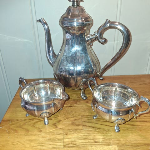 Vintage kaffekanne med fløtemugge og sukkerskål I sølvplett, selges samlet