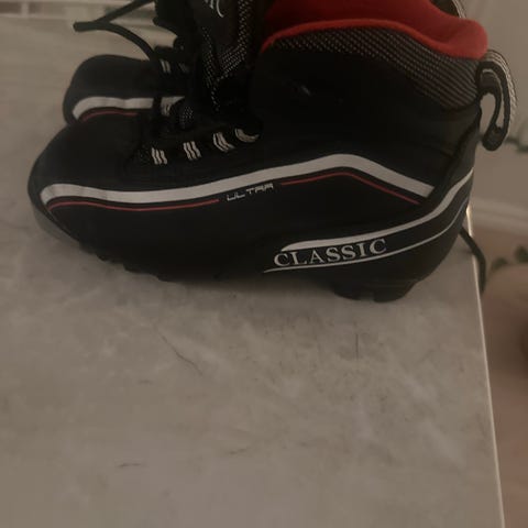 Classic skisko i sølv og svart med snøring og høyere ankel parti. Størrelse junior 38.