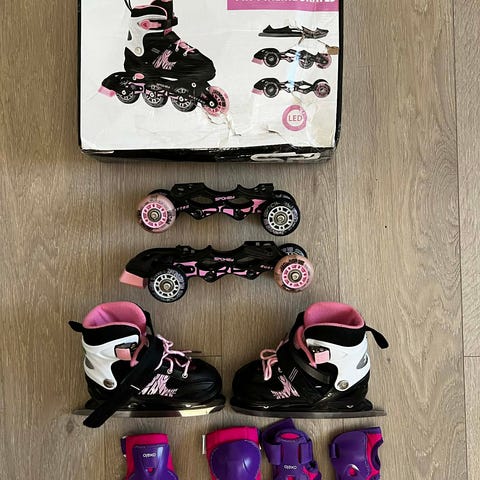 Medfølgende utstyr inkluderer et par håndleddsbeskyttere i svart med justerbare stropper. Settet passer til barn som ønsker å bruke rulleskøyter til lek og trening utendørs på jevnt underlag.