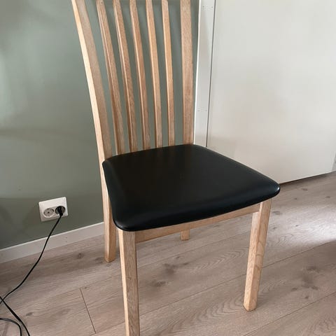 Polstret spisestol i grå tekstil med hel rygg og sete. Stolen har rette treben i lys trefarge og fastmontert setepute. Egner seg til bruk ved spisebord eller som ekstra stol i stue eller kontor.
