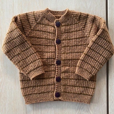 Nydelig hjemmestrikket genser, myk og kløfri. Vært en favoritt her- kan brukes med knappene både foran og bak. Har fungert her fra 2 til 4 år. Mener den er strikket i Sandnes Duo (55% merinoull og 45% bomull)- såvidt jeg husker 🤎