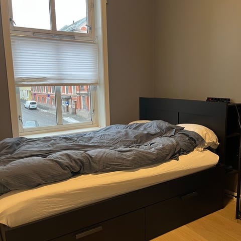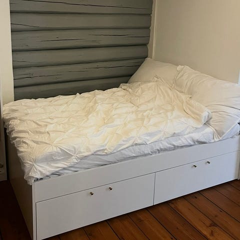 IKEA dobbeltseng i hvit. Sengen er brukt i en studenthybel i under 1 år, og er veldig pent brukt! Ingen slitemerker! Madrass og overmadrass inkludert. Madrass er 2 stk 80x200 og 1 stk 160x200 overmadrass, ingen merker.