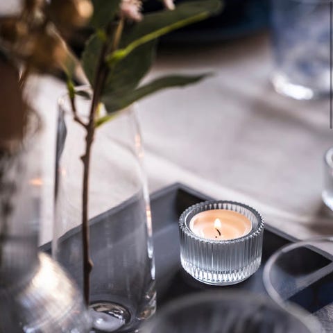 IKEA telys i klart glass med rillemønster, brukt i bryllup. Noen av dem må vaskes litt pga voks.