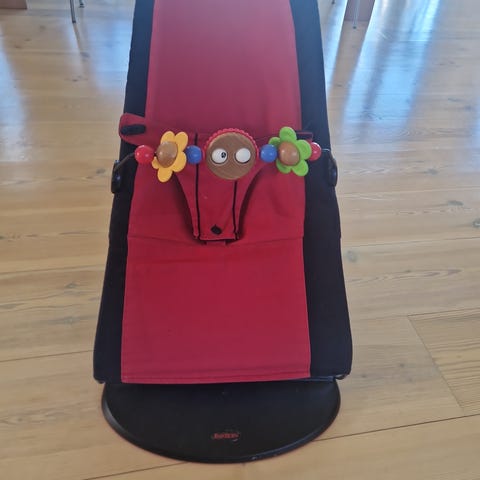 Babybjörn vippestol i rød og svart. Barnestolen har polstret sete med integrert sele og støtte til barnet. Stabil base med flere innstillinger for vinkel og posisjon. Egnet for små barn som trenger støtte til å sitte og hvile. Stofftrekket kan tas av for rengjøring etter produsentens anvisninger.