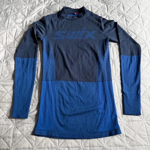 Swix ullundertøy bukse for dame i størrelse M. Lang underbukse i ribbestrikket materiale med hvit hovedfarge og røde sømmer. Ifølge vaskelappen består stoff 1 av 68 % polyester og 32 % ull, mens stoff 2 består av 100 % polyester. Buksen har strikk i livet og ettersittende passform som egner seg som innerste lag ved ulike utendørsaktiviteter og fritidsbruk i kjølige temperaturer.
