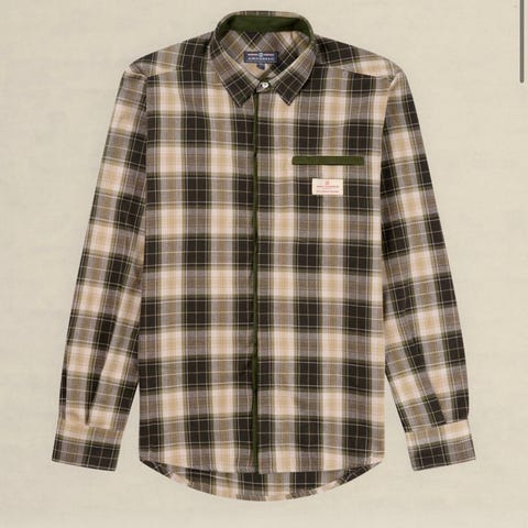 Moods of Norway skjorte for herre i størrelse M. Skjorten er laget av bomull og har et flerfarget rutete/feltmønstret design i jordtoner og lyse nyanser. Klassisk skjortemodell med krage, lange ermer og knappelukking foran. Liten traktorlogo brodert på brystet. Passer til hverdagsbruk eller uformelle anledninger.