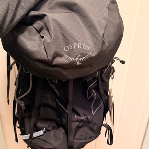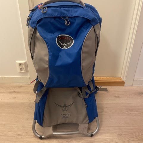 Bæremeis fra Osprey. Brukt i ett år. Har vært veldig førnøyd med denne, siden den er så lett og sitter godt på ryggen. Det er også relativt god plass til og pakke med seg ekstra ting. + at det er lomme til vannpose på ryggen. Brukte denne på en ukes fjelltur i fjor sommmer. Genialt med solskjermingen og regntrekket, som også skjærmer for vind.