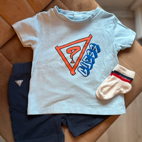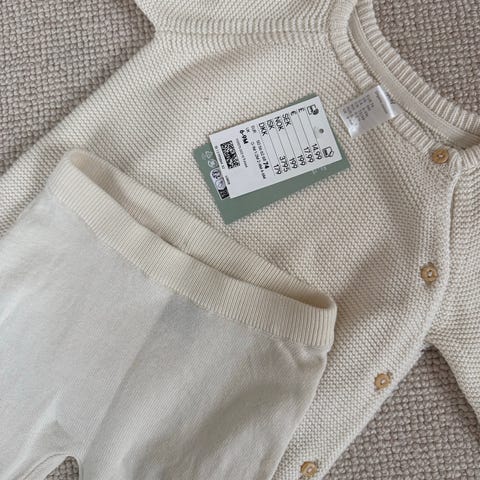 Hema babysett bestående av genser og bukse i størrelse 74. Sett i oransje farge, laget i bomull. Unisex-modell som passer både til gutt og jente. Genser med lange ermer, bukse med strikk i livet og knapper foran. Egnet til hverdagsbruk for baby i ca. 6–9 måneders alder, avhengig av barnets størrelse.