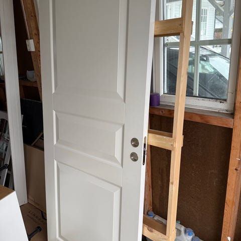 Innvendig skyvedør i hvitmalt tre. Døren har klassisk profilert fyllingsdesign med flere rektangulære felt.