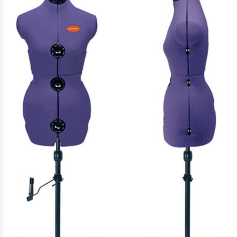 Prymadonna byste justerbar sybyste i lilla tekstiltrekk. Bysten står på et høyderegulerbart stativ med tre ben i metall. Kroppen har flere dreiehjul for trinnløs justering av mål rundt bryst, midje og hofte, angitt både i centimeter og tommer. Egnet som prøvedukke og til tilpasning av klær ved søm og mønsterkonstruksjon. fra str M/L
