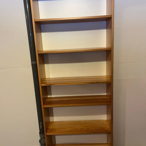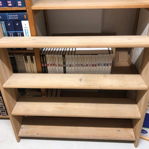 Lys og bred BBB-reol av klassikerutgaven. Med metallbeslag på hyllenes kortsider. Inkluderer alle skruene og 2 metallskråstag. Se på alle bildene. Har enten ubehandlet overflate eller er lutet for 30-50 år siden. Hentes på Tåsen i Oslo. Spør om hjemkjøringsmulighet innen Oslo.