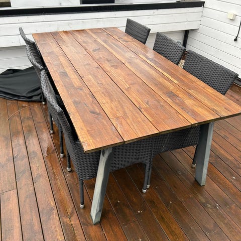 Unikt hagemøbel-sett selges! Perfekt for deg som er opptatt av design og god kvalitet. Dette er et solid sett i en vakker kombinasjon av tre og jern, med nydelige detaljer i metallarbeidet. Settet består av et bord, to stoler og en benk. Det er tungt, stabilt og i kjempegod stand. Et smykke for uteplassen!' Håper den faller i smak!