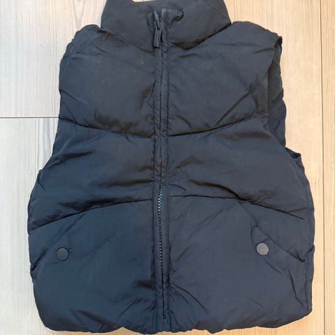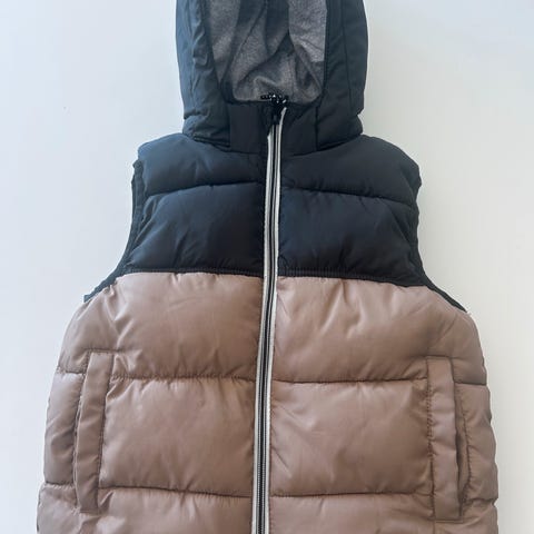 H&M vest for barn i størrelse 92. Vesten er flerfarget med felt i mørke og lyse toner. Materialet er polyester med vattert fyll. Modellen er uten ermer og har hette. Unisex-passform som passer både gutter og jenter. Egnet som et ekstra lag over genser eller genserjakke i kjøligere vær.