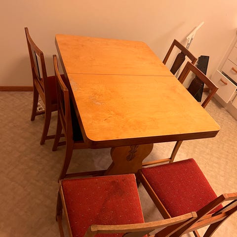 IKEA spisebord med 4 stoler. Ikke perfekt, men fungerer bra. Skal hentes.