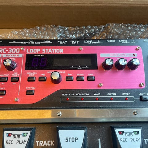 Boss RC-300 Loop Station looper pedal for gitar, mikrofon og andre instrumenter. Enheten har tre uavhengige spor med egne fotbrytere for start og stopp av hver kanal. Frontpanelet har innebygd kontrollseksjon med display, nivåkontroller, effekter og ulike funksjonsknapper. Pedalen er svært lite brukt og er 100% i orden!