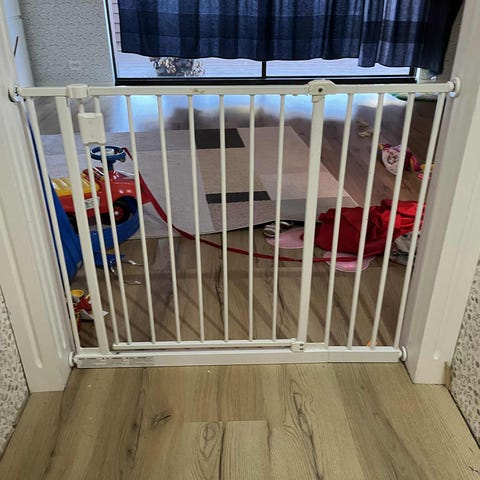 Hard Head sikkerhetsgrind i hvit metallutførelse. Grind beregnet for montering i døråpning eller ved trapp for å sperre av områder i hjemmet. Medfølgende forlengere gjør det mulig å tilpasse bredden til ulike åpninger. Egnet til bruk som barnegrind eller husdyrgrind innendørs.