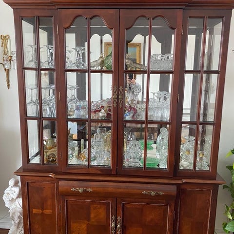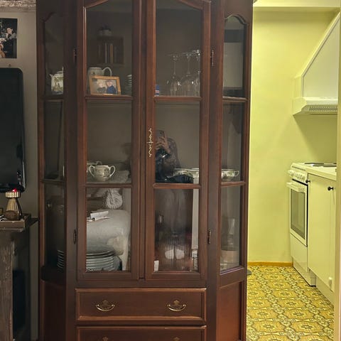 Hjørneskap i mørkt tre med øvre glassdør og nedre tredør. Skapet har flere hyller på innsiden for oppbevaring og er utformet for å stå i et hjørne. Øvre del har sprosset glass som gir innsyn til innholdet, mens nedre del er lukket for skjult oppbevaring. Passer til stue, spisestue eller gang for oppbevaring av servise, pyntegjenstander eller andre småting.