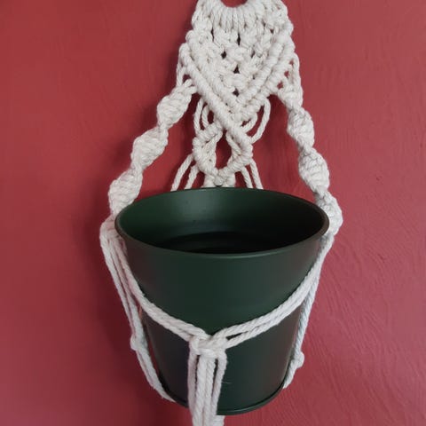 Makramé blomsterampel med keramisk potte. Ampelen er laget i naturfarget tau med røde dekorperler. Potten er rød/brun med rillemønster. Egnet til oppheng av potteplanter innendørs. Henges enkelt opp i krok i tak eller på vegg. Selges uten urne