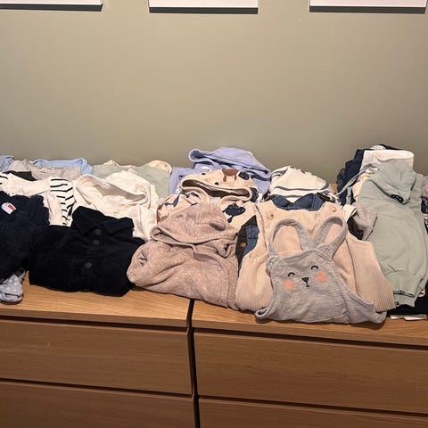 Mange ulike bodyer, pysj, luer, ull, ulldresser. Medfølge silverette brukte kun 2 ganger og ammeinnlegg i ull st medium. Selges alt sammen! Alt nyvasket og strøket klar til ny baby ❤️