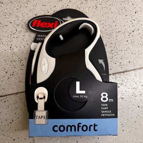 Flexi Comfort L hundebånd med inntrekkbar tape på 8 meter. Egnet for hunder opp til maks 50 kg. Håndtak med ergonomisk utforming for bedre grep. Fargekombinasjon rød, hvit og svart. Passer til turer og daglig bruk med mellomstore og store hunder.
