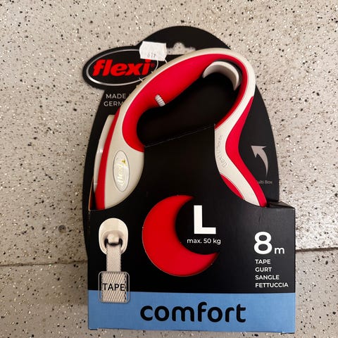 Flexi Comfort hundebånd i størrelse L med 8 meters tape-bånd. Egnet for hunder opp til 50 kg. Automatisk inntrekkbar line med bånd (tape) i stedet for rund snor. Ergonomisk håndtak for komfortabel bruk. Passer til turer med mellomstore og store hunder der man ønsker lengre rekkevidde samtidig som man har kontroll på hunden.