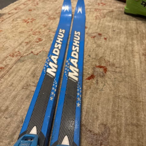 Madshus langrennski i blå og hvit farge. Skiene har Rottefella-bindinger montert, egnet for klassisk langrenn. Passer til bruk i preparerte løyper. Designet for bruk med kompatible langrennsstøvler til Rottefella-systemet. Skiene har tradisjonell lang og smal konstruksjon tilpasset tur- og treningsbruk på snø. Vekt på person som har brukt skiene er 66 kg. Jeg har vipps.