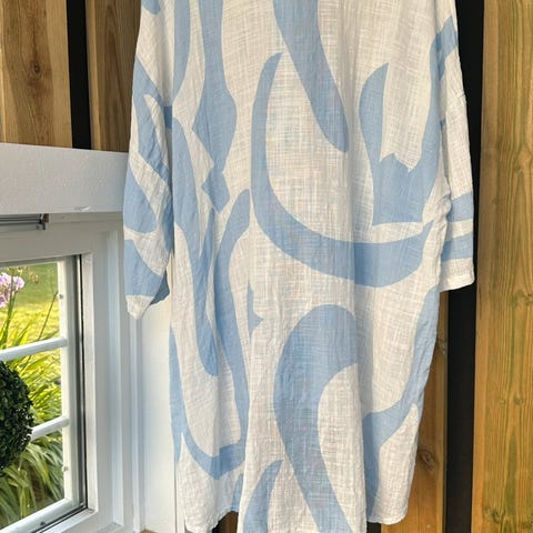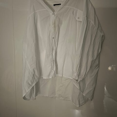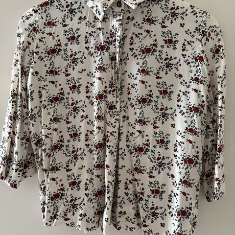 Passer M til XL. Blusen er flerfarget med blomstrete mønster i hovedsakelig blå, brune og grønne toner på lys bunn. Hullmønster. Materialet er 100 % bomull. Modellen har lange ermer med rynkedetaljer og løs passform med avrundet nederkant. Lenger bak. Passer til hverdagsbruk og kan kombineres med både bukser og skjørt.