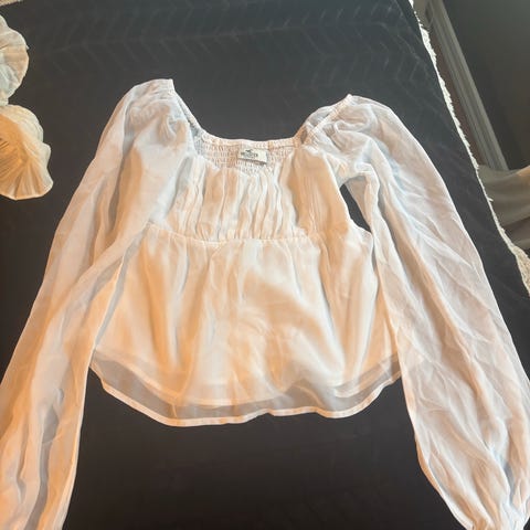 ONLY bluse for dame i størrelse XS. Blusen er hvit og laget av bomull. Den har lange ermer, rysjedetaljer og knappelukking i nakken. Passer til hverdagsbruk eller mer pyntede anledninger, og kan kombineres med både bukser og skjørt.r