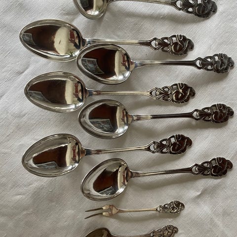 Nydelig ekorn sølv! Den store skjeen er 99 gram. Markedsprisen på 99 gram 830 sølv er idag 2071. Selges for over 2200. 22,4 cm. den lille er 45 gram, 17,2 cm, selges for 1200. Jeg selger denne for over den prisen, og tør ikke sende i posten. Bor nær Oslo.