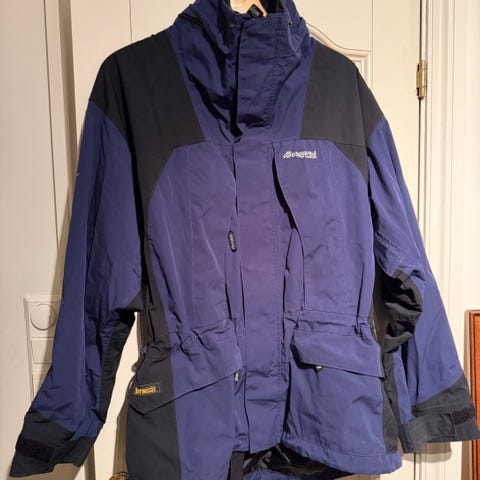 Bergans hettejakke for herre i størrelse L. Jakken er blå med mørkere blå kontrastfelt på sidene og under ermene. Den har hette, hel glidelås i front og to glidelåslommer i siden. Egnet som lett ytterlag eller mellomlag til fotturer og annen friluftsbruk.