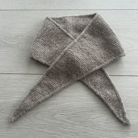 Skjerfet har et strikket hull i den ene siden som gjør det lett å ta av og på. Skjerfet er lett tovet og lett dampet.