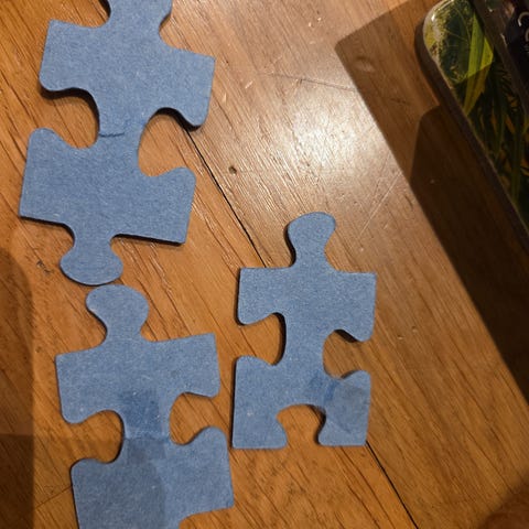 26 puslespill med 1000 brikker i ulike motiv, alt fra norske byer til fantasibilder. Puslespillplate i hard filt med lokk og skuffer til brikker, 54 x 78 cm. Det er også med et filtteppe. Dette må hentes!